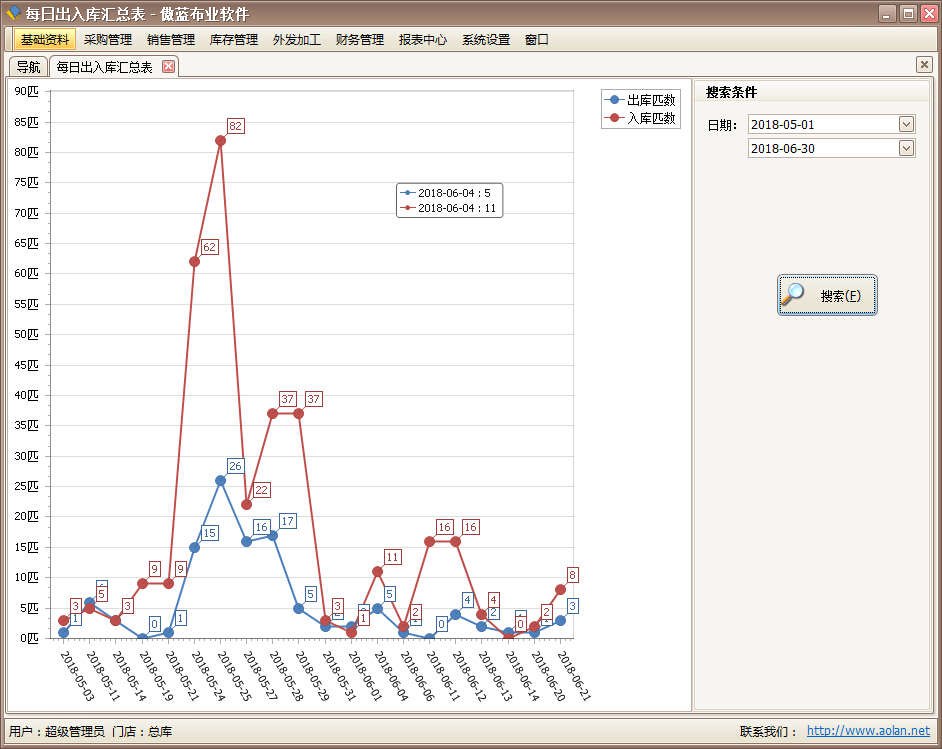每日出入匯總表:以圖形報表的形式顯示每日出入布品信息情況。圖形模式展示,更加清晰的顯示布品倉庫中每日出入的總量。