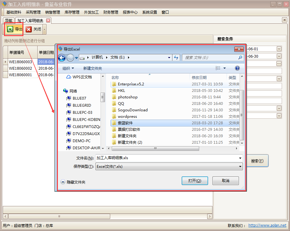 導出是把當前列表中所有的記錄以 Excel 表格方式導出。在加工入庫明細表列表界面上,點擊【導出】按鈕。