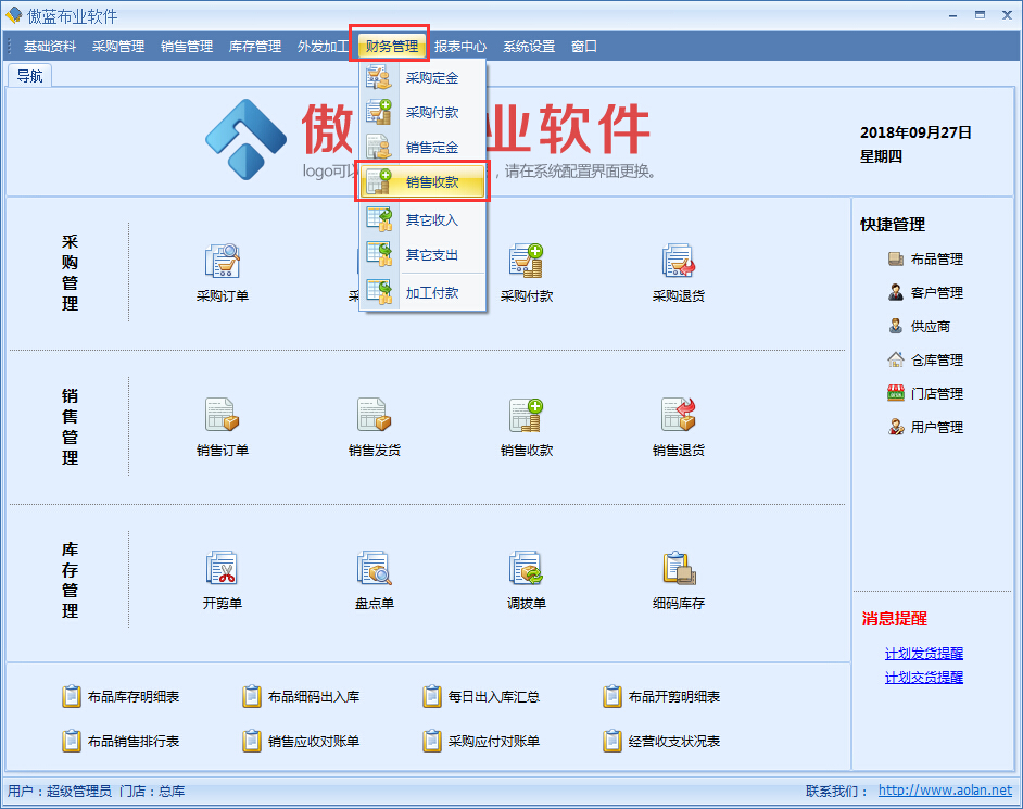 當客戶的布匹已經發貨后,就可以對銷售發貨單據進行收款了,這時可以通過【財務管理】中的【銷售應收單】錄入銷售收款信息,這里的銷售收款單對應的是銷售發貨單據,如果沒有進行發貨就不能進行收款的。