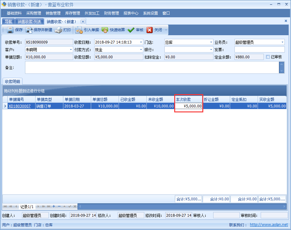 傲藍布匹銷售管理系統,銷售收款單主要是針對銷售發貨時應收的貨款,同樣,收款單也支持一次性收取多批單據費用。銷售收款單包括單據日期、客戶、付款方式、發票、銀行、收款金額等信息。明細列表中是每筆采購單的單據金額、已付金額、未付金額、扣除定金、折扣金額、實付金額等信息。