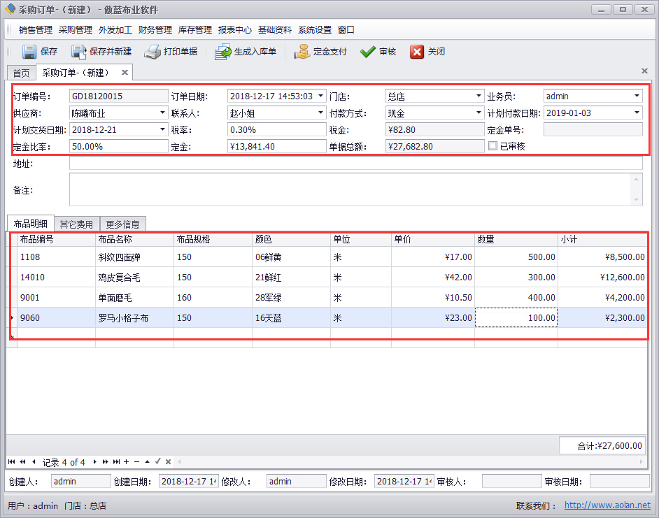 傲藍(lán)布業(yè)軟件提供【采購(gòu)訂單】管理功能,采購(gòu)訂單就是對(duì)布行的布品采購(gòu)做合理的采購(gòu)計(jì)劃,并快速的計(jì)算出采購(gòu)的預(yù)算。在軟件中添加布品的信息以及采購(gòu)數(shù)量和單價(jià),軟件即可自動(dòng)計(jì)算出采購(gòu)預(yù)算,還可以添加在采購(gòu)過(guò)程可能產(chǎn)生的其它費(fèi)用,將采購(gòu)預(yù)算一步計(jì)算到位。