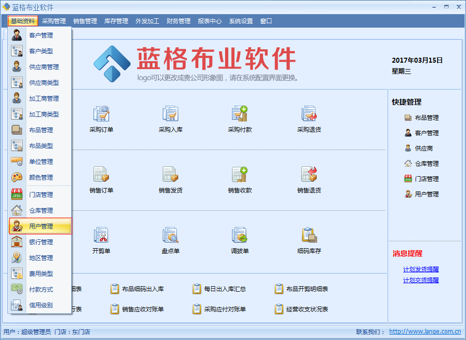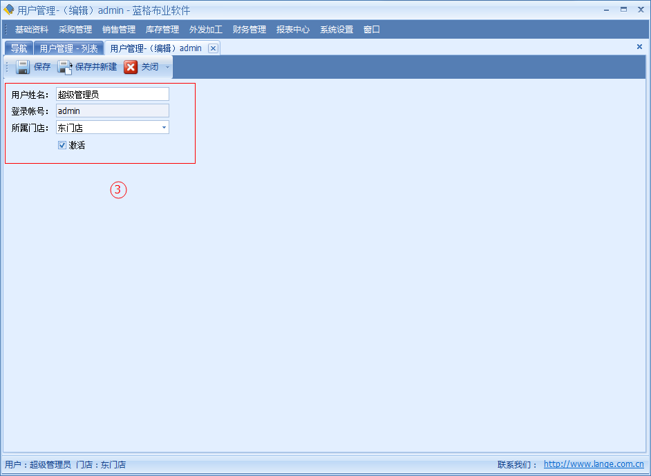 傲藍(lán)布匹管理系統(tǒng)用戶管理功能主要是對于布行管理系統(tǒng)操作者的管理,可以自行添加使用軟件系統(tǒng)的用戶或禁止指定用戶,被禁止的用戶不能登錄使用傲藍(lán)布行管理系統(tǒng)。