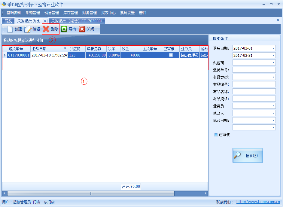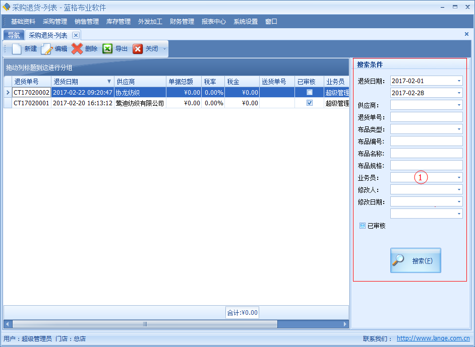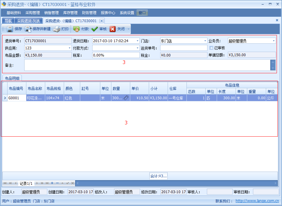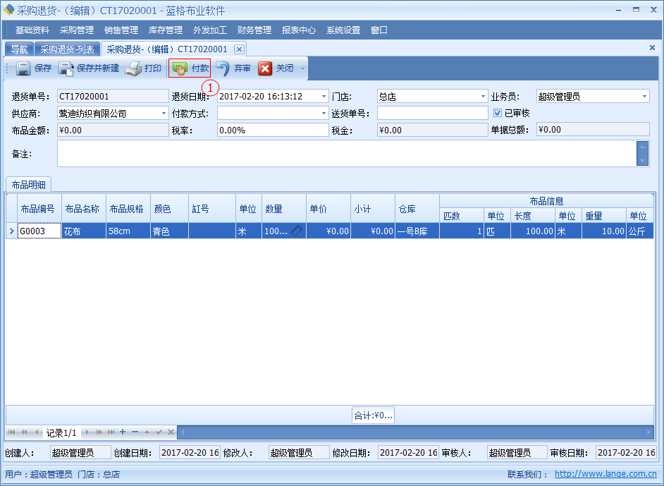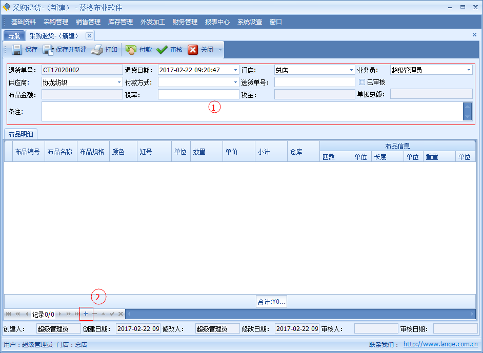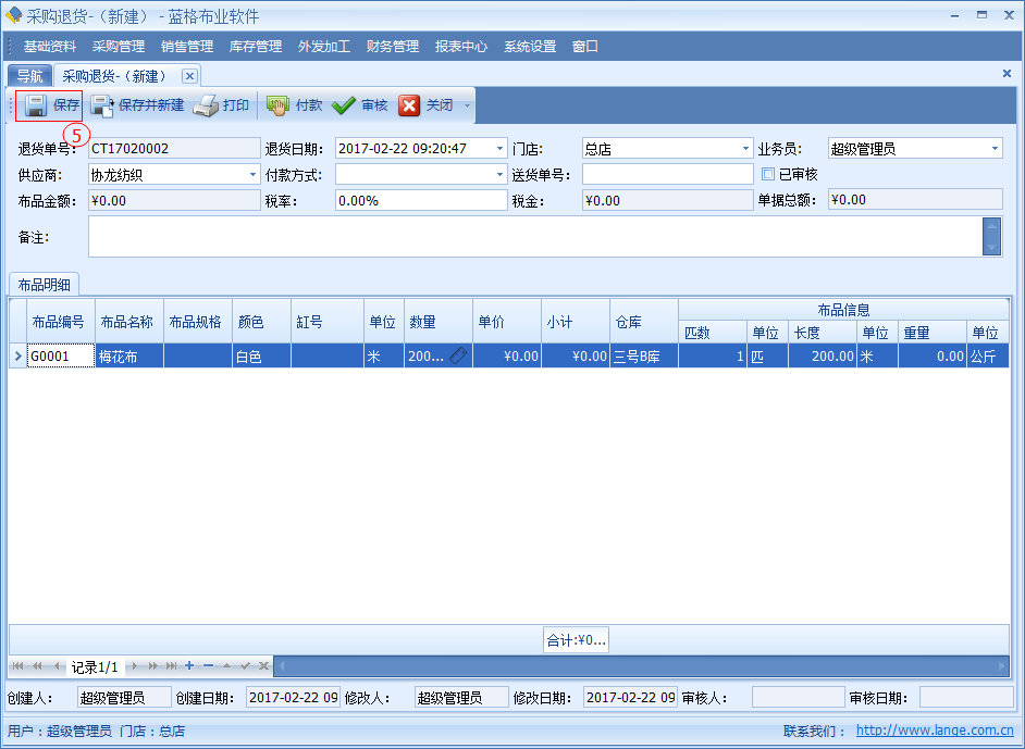 當(dāng)采購(gòu)布品回來(lái)時(shí)發(fā)現(xiàn),布品中有破損、布品不對(duì)或者其他情況需要退貨給供應(yīng)商,并且取回來(lái)已經(jīng)支付給供應(yīng)商的布匹款項(xiàng)。傲藍(lán)好布業(yè)軟件中可以通過(guò)【采購(gòu)?fù)素洝縼?lái)操作。采購(gòu)?fù)素泦螕?jù)包括退貨日期、要退貨的采購(gòu)單、供應(yīng)商、倉(cāng)庫(kù)、金額等信息。明細(xì)列表中包括單據(jù)要退貨的布品名稱、顏色、單位、數(shù)量、明細(xì)碼價(jià)格等詳細(xì)數(shù)據(jù)。