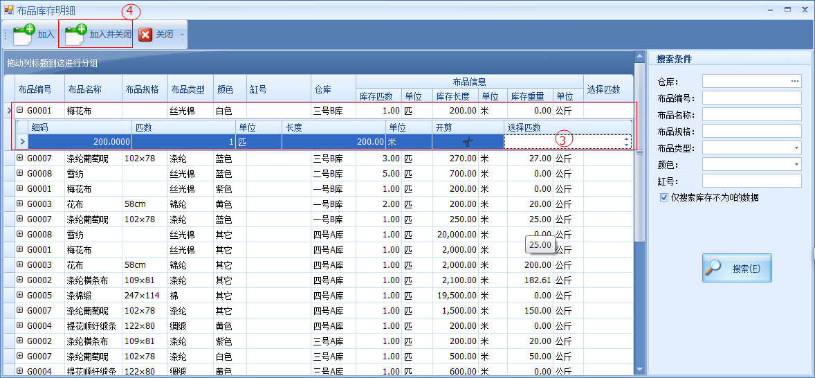 ○3 從庫(kù)存選擇需要退貨的匹數(shù)