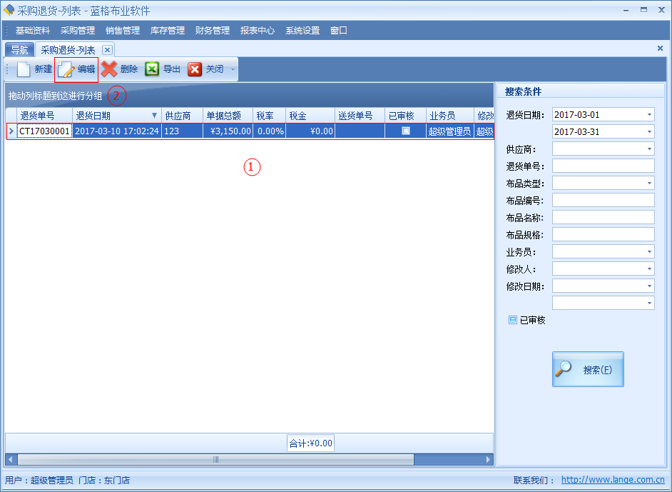 如需要對(duì)采購(gòu)?fù)素浤骋粭l數(shù)據(jù)進(jìn)行修改的,通過(guò)采購(gòu)?fù)素浟斜磉x中一條記錄點(diǎn)擊【編輯】按鈕,進(jìn)入