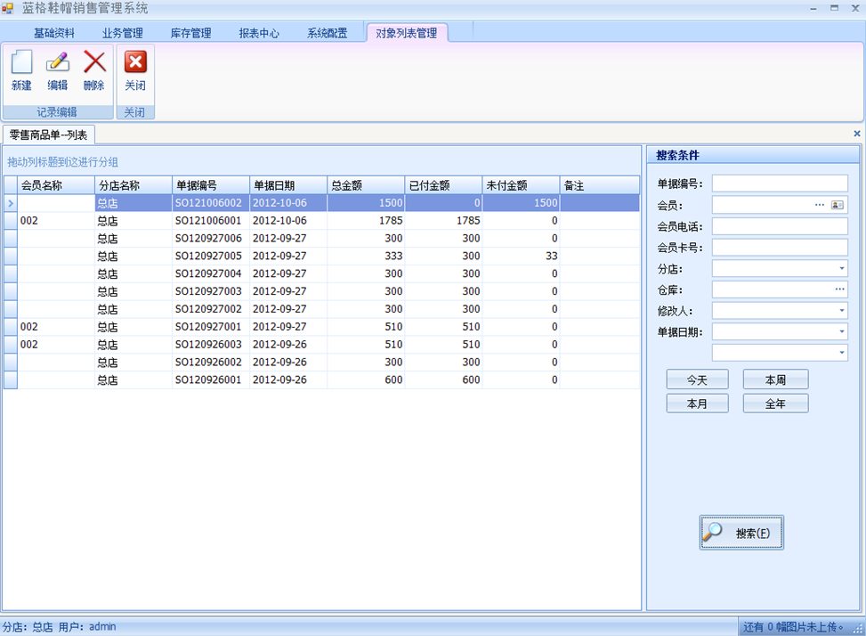 登錄傲藍鞋帽銷售管理系統(tǒng)后點擊【業(yè)務(wù)管理】->【零售列表】, 打開零售單據(jù)列表界面,該界面可以進行查詢,查詢相關(guān)零售單的信息,雙擊該單據(jù)打開零售詳細信息界面。零售單據(jù)列表界面包括編輯零售單,刪除單據(jù)和建立新的單據(jù)三個功能。如下圖: