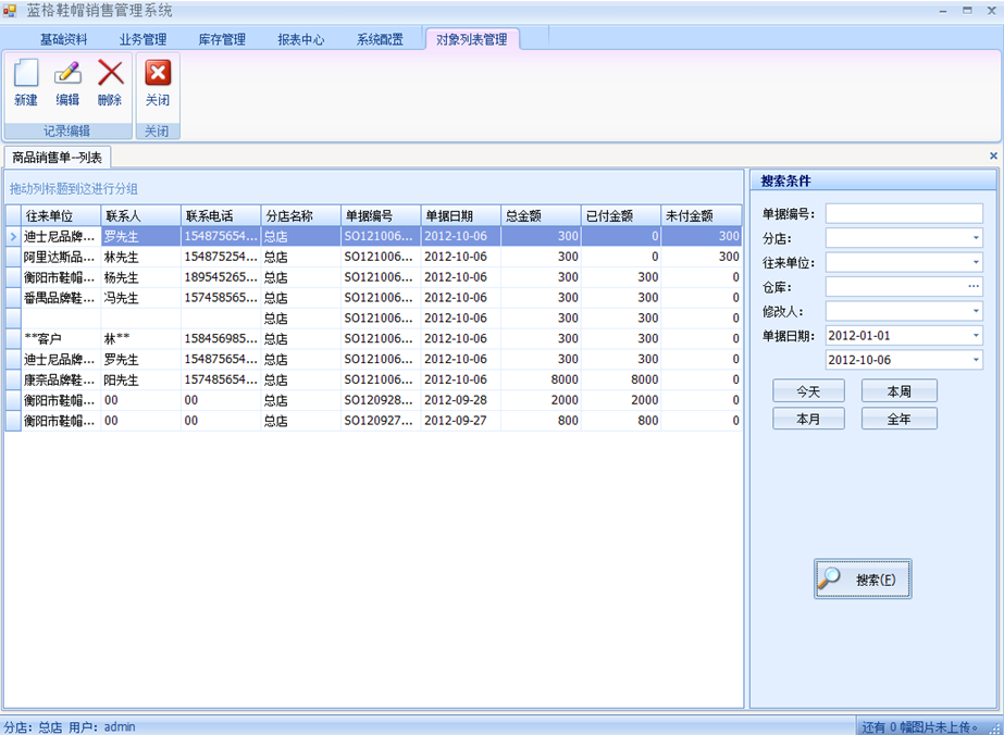 登錄傲藍鞋帽銷售管理軟件后點擊【業(yè)務(wù)管理】->【銷售列表】, 打開銷售單據(jù)列表界面,該界面可以進行查詢傲藍鞋帽銷售管理軟件中之前錄入的相關(guān)銷售單信息,雙擊銷售單據(jù)打開銷售詳細信息界面。銷售單據(jù)列表界面包括編輯銷售單,刪除單據(jù)和建立新的單據(jù)三個功能。如下圖: