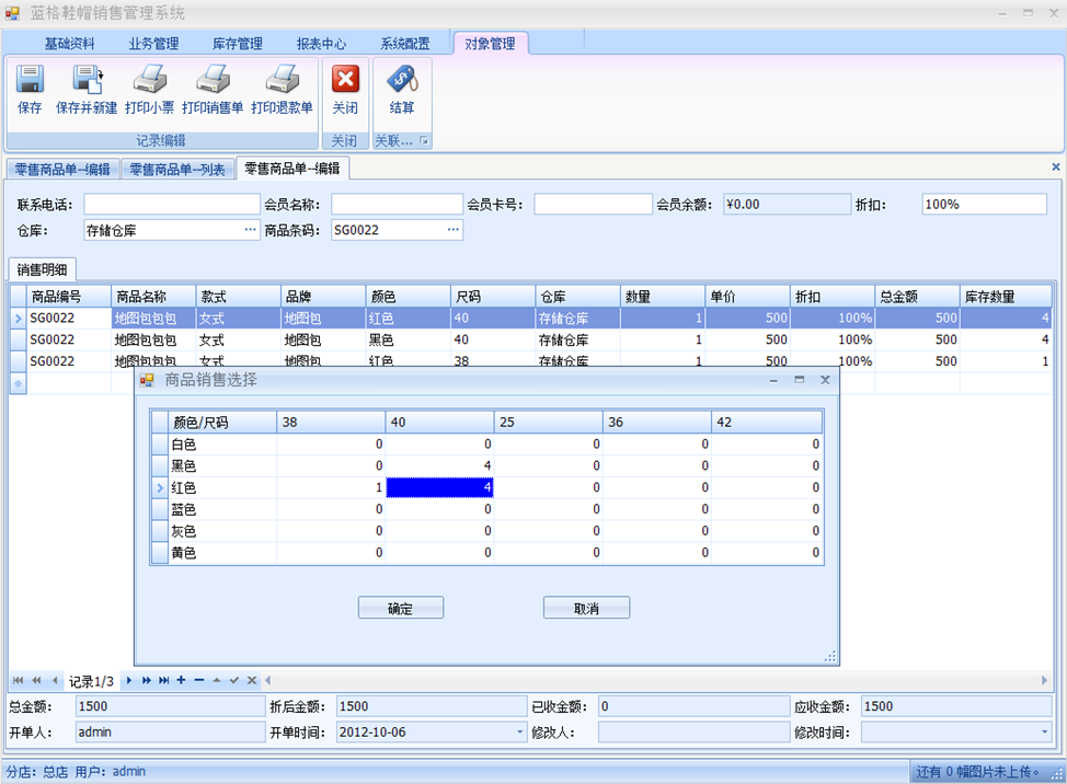 在上圖中點擊【新建】打開銷售商品單據(jù)編輯界面。填寫好單據(jù)相關(guān)的信息。然后點擊【保存】這樣就把該銷售商品錄入到傲藍鞋帽銷售管理系統(tǒng)中。當在上圖中選擇一個單據(jù)點擊【編輯】,在該界面中會顯示選擇單據(jù)的詳細信息,修改其中的項目,然后點擊【保存】,單據(jù)信息就更新完成。在商品條碼框中輸入商品條碼然后按回車鍵,系統(tǒng)會自動把該商品加入到銷售列表中,當該條碼對應(yīng)多個商品時,會彈出商品選擇框,選擇詳細的商品。如下圖所示: