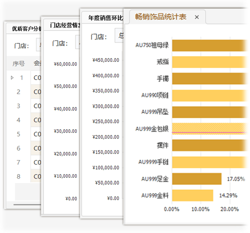 全面支持鉆石、金、銀、翡翠、玉器、普通、鑲嵌飾品等,滿足珠寶銷售行業銷售多種類型飾品的需求。可管理到禮品兌換,貨品換貨,舊金回收,舊金換新品,飾品鑲嵌、組裝等以及維修入庫、出庫等其它出入庫。