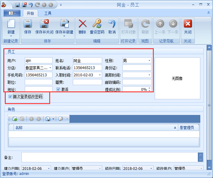 ①分店信息建立完成,就要建立分店總的管理人員的員工信息,確定員工登錄軟件的用戶名、所屬門店、員工資料;設(shè)置員工首次登錄軟件需要修改密碼并賦予員工相應(yīng)的軟件操作權(quán)限,以及員工的初始登錄密碼,如圖: