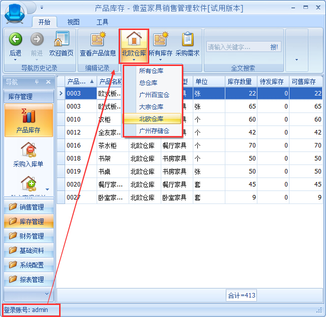 傲藍家具商城管理軟件總店管理員賬號,可以查詢各個分店倉庫的庫存數量,如圖:
