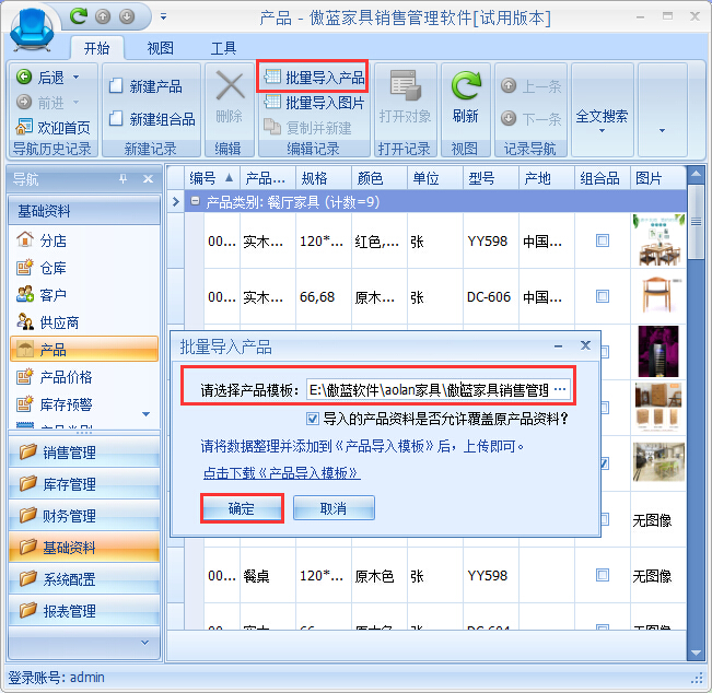 ④將修改好的家具產(chǎn)品資料信息導(dǎo)入到軟件中,點(diǎn)擊【批量導(dǎo)入產(chǎn)品】,選中修改后的①的產(chǎn)品信息表格,將產(chǎn)品資料導(dǎo)入至系統(tǒng),如圖:
