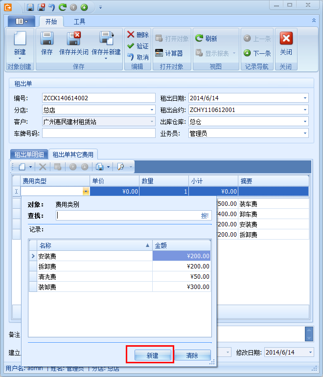 選擇費用類型前可先建立【費用類型】,可以通過點擊下拉菜單新建,新建租賃站的其它費用類型,進行編輯管理,如下圖
