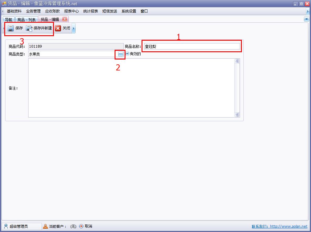 傲藍冷庫信息管理系統對于貨品資料的建檔管理,以便于業務操作時的選擇自動生成,例如入庫單操作,選擇所要入庫的商品即可,免除了人為重新錄入的繁瑣。