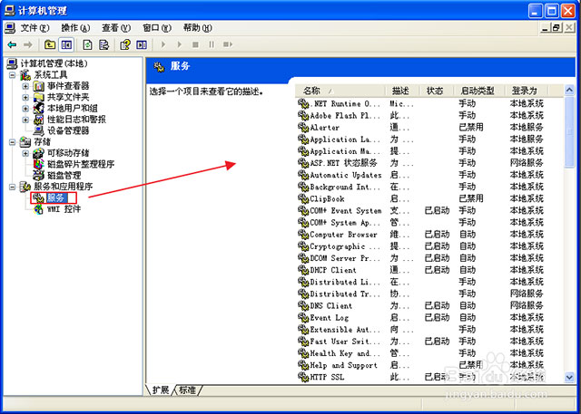 在“計算機管理”右側會顯示電腦已經安裝的所有服務。