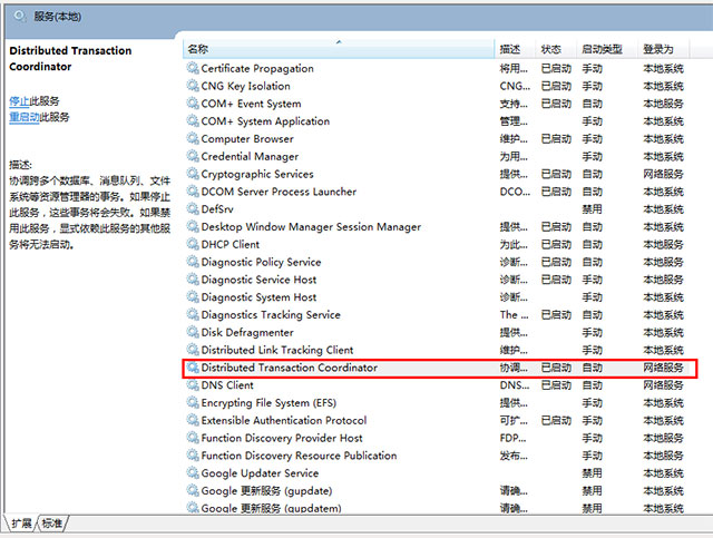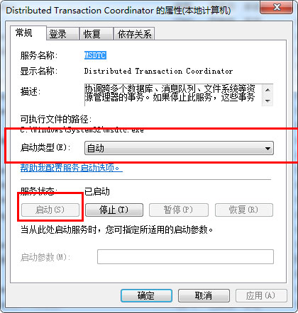 右擊【Distributed Transaction Coordinator】屬性。選擇啟動類型為自動,并且點擊啟動。