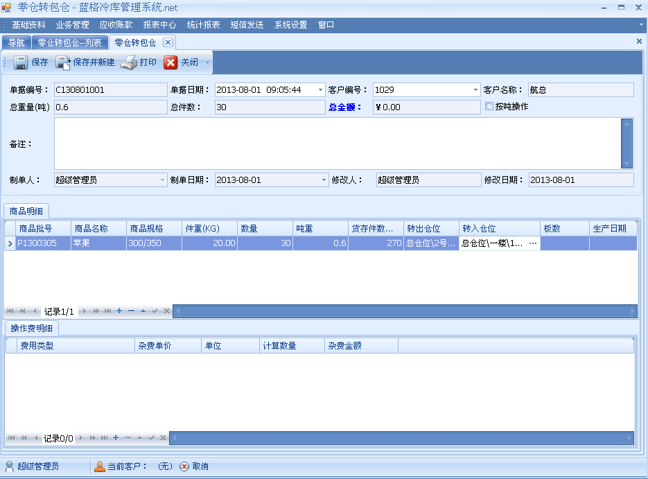 零倉轉包倉操作點擊,點擊冷庫管理軟件的業務管理的“零倉轉包倉”選擇需要轉倉的時間和貨主商品批號和件數,保存即可。如圖操作: