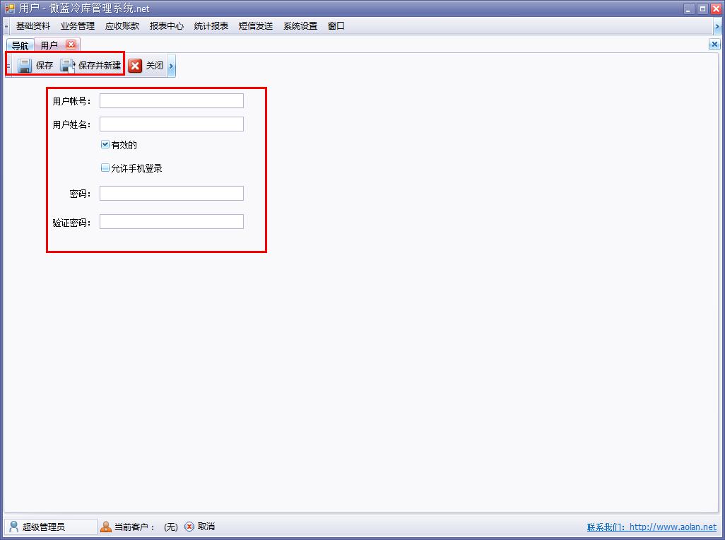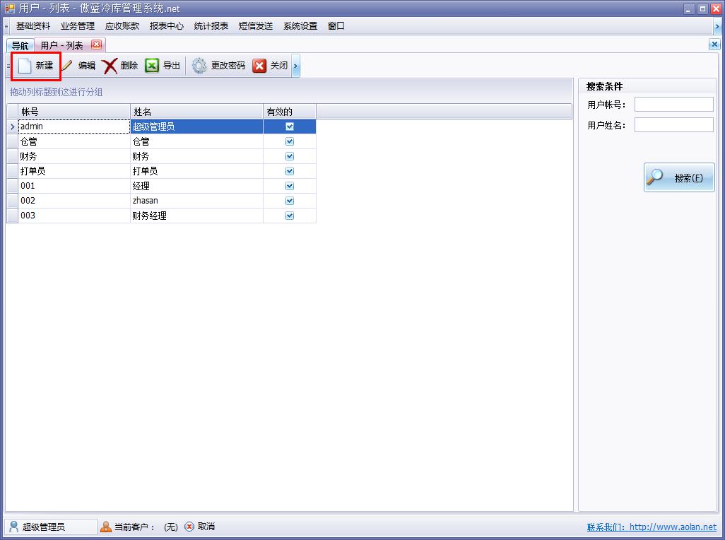 傲藍冷庫管理軟件用戶管理功能模塊主要是對于冷庫管理信息系統操作者的管理,可以自行添加使用軟件系統的用戶,或者禁止指定用戶,被禁止的用戶不能登陸使用軟件系統。