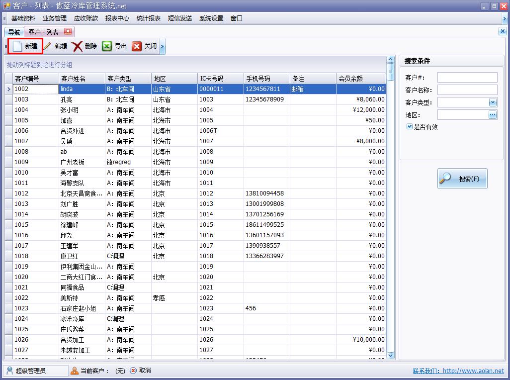 貨主資料管理是傲藍(lán)冷庫(kù)信息管理系統(tǒng)對(duì)于冷庫(kù)企業(yè)客戶資料進(jìn)行管理的功能,例如:客戶類型、客戶信譽(yù)級(jí)別、客戶公司性質(zhì)、客戶企業(yè)所在地區(qū)、客戶結(jié)算方式、結(jié)算使用的現(xiàn)金銀行等信息的管理。