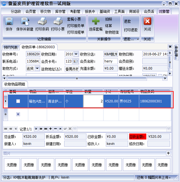 錄入相關的需要護理保養的皮革信息保存就可以完成該會員的收物開單,如圖: