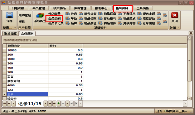 門店一般會(huì)為客戶建立會(huì)員資料,對(duì)于長(zhǎng)期固定的客戶我們會(huì)給一定的折扣,這時(shí)就需要為這些客戶定一個(gè)折扣的級(jí)別,我們就在皮具護(hù)理管理軟件基礎(chǔ)資料內(nèi)的會(huì)員級(jí)別里設(shè)置,如下圖: