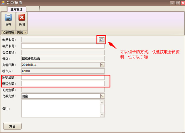 點擊【會員充值】進入充值界面,可以通過讀卡的方式快速的獲取會員資料,也可以手動輸入,靈活的操作的界面,沖值金額,贈送金額,付款方式填寫好,保存