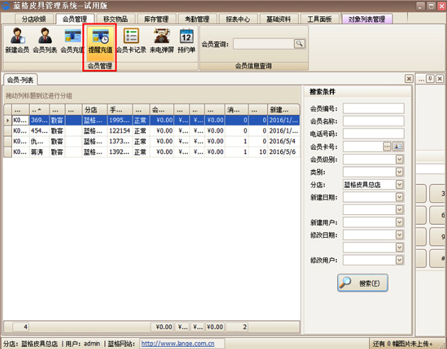 會員的基礎信息建立好后,傲藍皮具護理管理軟件如何給會員快速的充值,并查看充值信息。