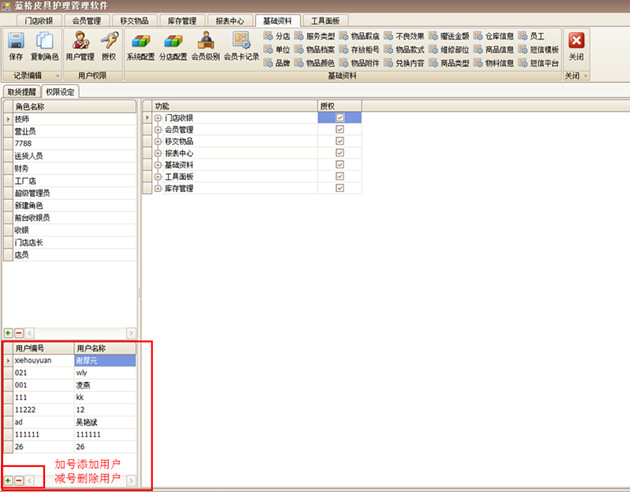 傲藍皮具護理管理軟件的用戶管理,可以用超級賬號admin建立子賬戶,并在授權時管理每個員工的操作權限,讓每個員工分工明確,做事井然有序。