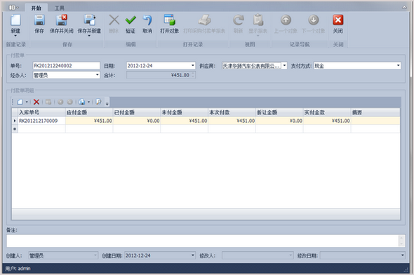 選擇配件之后配件的其它信息會自動帶出,只要填寫完數(shù)量(數(shù)量必須大于0)即可驗證通過保存。