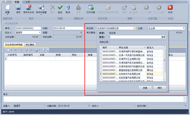 傲藍(lán)汽車維修管理系統(tǒng)-新建供應(yīng)商退貨單詳細(xì)界面