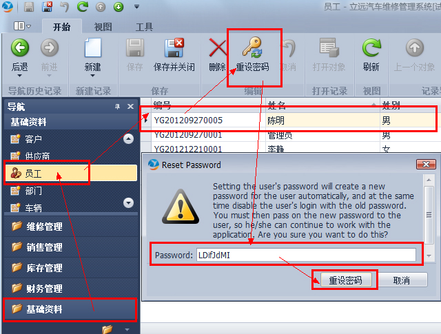 如何查看一個(gè)用戶的密碼呢?答案是無(wú)法查看,即使是管理員也無(wú)法查看。如果您屬下的某個(gè)員工忘記了密碼了,那么您可以用您的管理員賬號(hào)登陸系統(tǒng),并且在“基礎(chǔ)資料”-“員工”中找到并選中該員工,點(diǎn)擊工具欄的“重設(shè)密碼”按鈕,在彈出的重設(shè)密碼窗口中輸入新的密碼即可,您也可以先為他設(shè)定簡(jiǎn)單的密碼,然后讓他登陸后自行重設(shè)密碼。