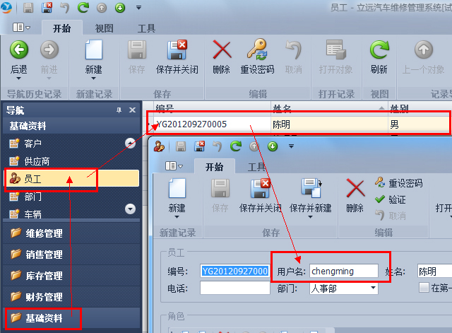 用戶名和密碼是登錄到傲藍(lán)汽車維修管理系統(tǒng)的兩把鑰匙,用戶名可以在“基礎(chǔ)資料”-“員工”,雙擊其中一個(gè)員工后,在“用戶名”字段中查看得到。