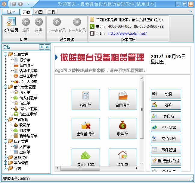 感謝您選擇并使用傲藍舞臺租賃管理系統,為了您能盡快熟悉系統的操作流程,請在使用本系統之前仔細閱讀此操作說明書。